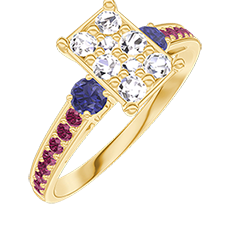 « L'ATELIER » NR 211070Pierścionek Żółte złoto 375 - Klaster naturalnych diamentów Prostokąt odpowiednik 1 - Kamienie boczne Niebieski szafir - Oprawa Rubin 4.5