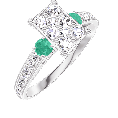 « L'ATELIER » NR 211087Pierścionek Białe złoto 750 - Klaster naturalnych diamentów Prostokąt odpowiednik 1 - Kamienie boczne Szmaragd - Oprawa Diament 4.6