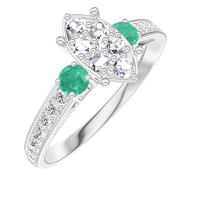 « L'ATELIER » NR 211388Pierścionek Białe złoto 375 - Klaster naturalnych diamentów Markiza odpowiednik 1 - Kamienie boczne Szmaragd - Oprawa Diament