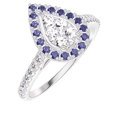 « L'ATELIER » NR 211631Pierścionek Białe złoto 750 - Klaster naturalnych diamentów Gruszka odpowiednik 0.5 - Korona z kamieni Niebieski szafir - Oprawa Diament 5