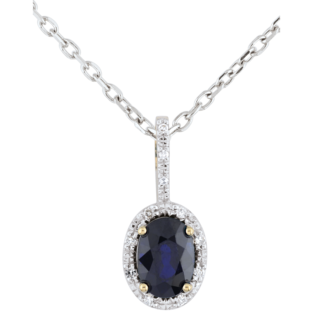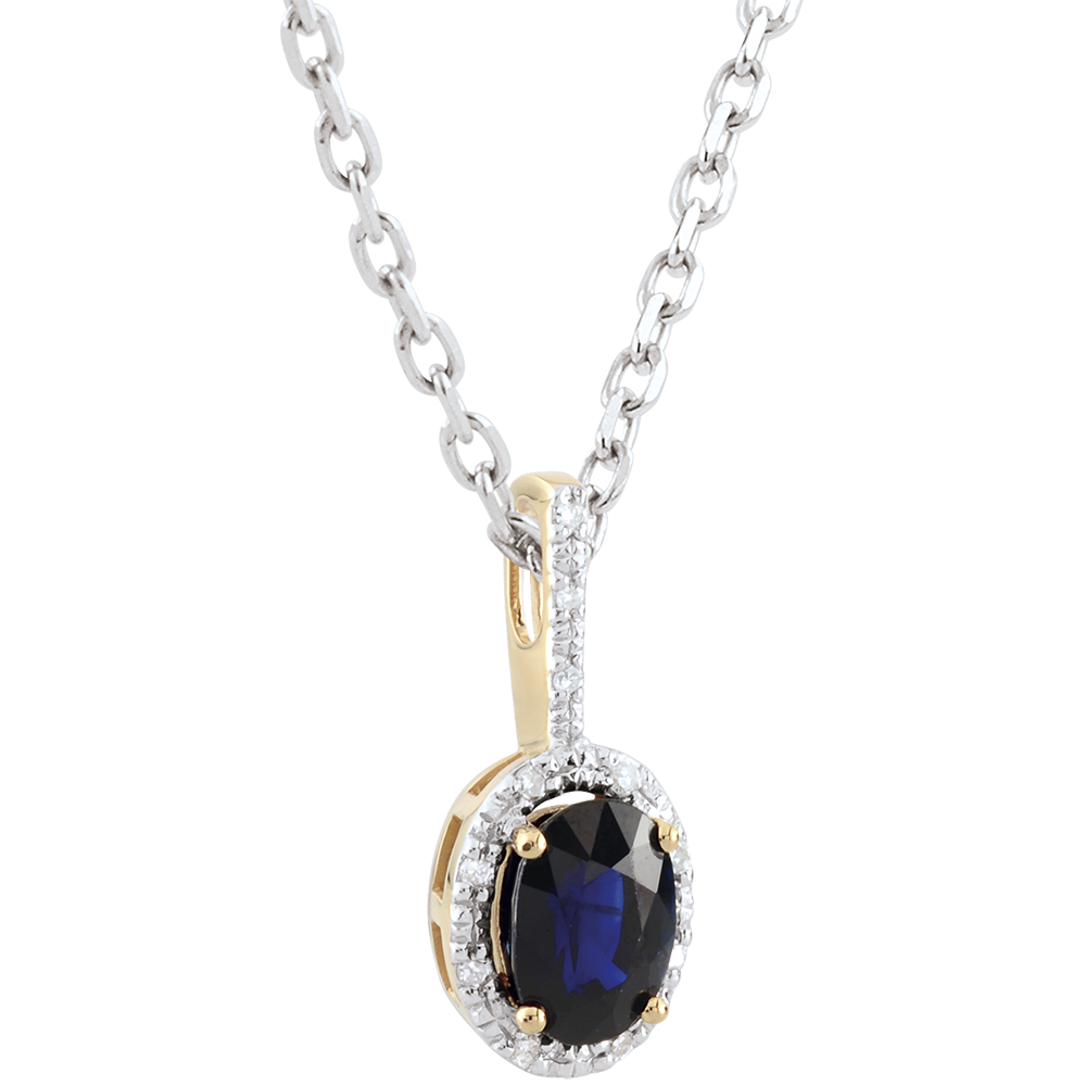 Szafiry oprawione w żółte złoto ukoronowane białym złotem i diamentami. Klasyczna i wyrafinowana zawieszka.