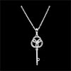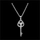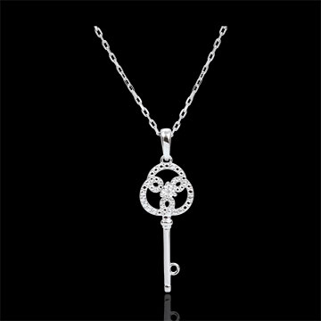 Zawieszka w kształcie klucza z białego złota o zmysłowych krzywiznach ozdobionych kwiatami ze złota, strzegącego na zawsze pojedynczego diamentu.