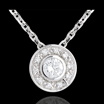Diament środkowy otoczony koncentrycznie oprawionymi diamentami w pełnej blasku zawieszce.