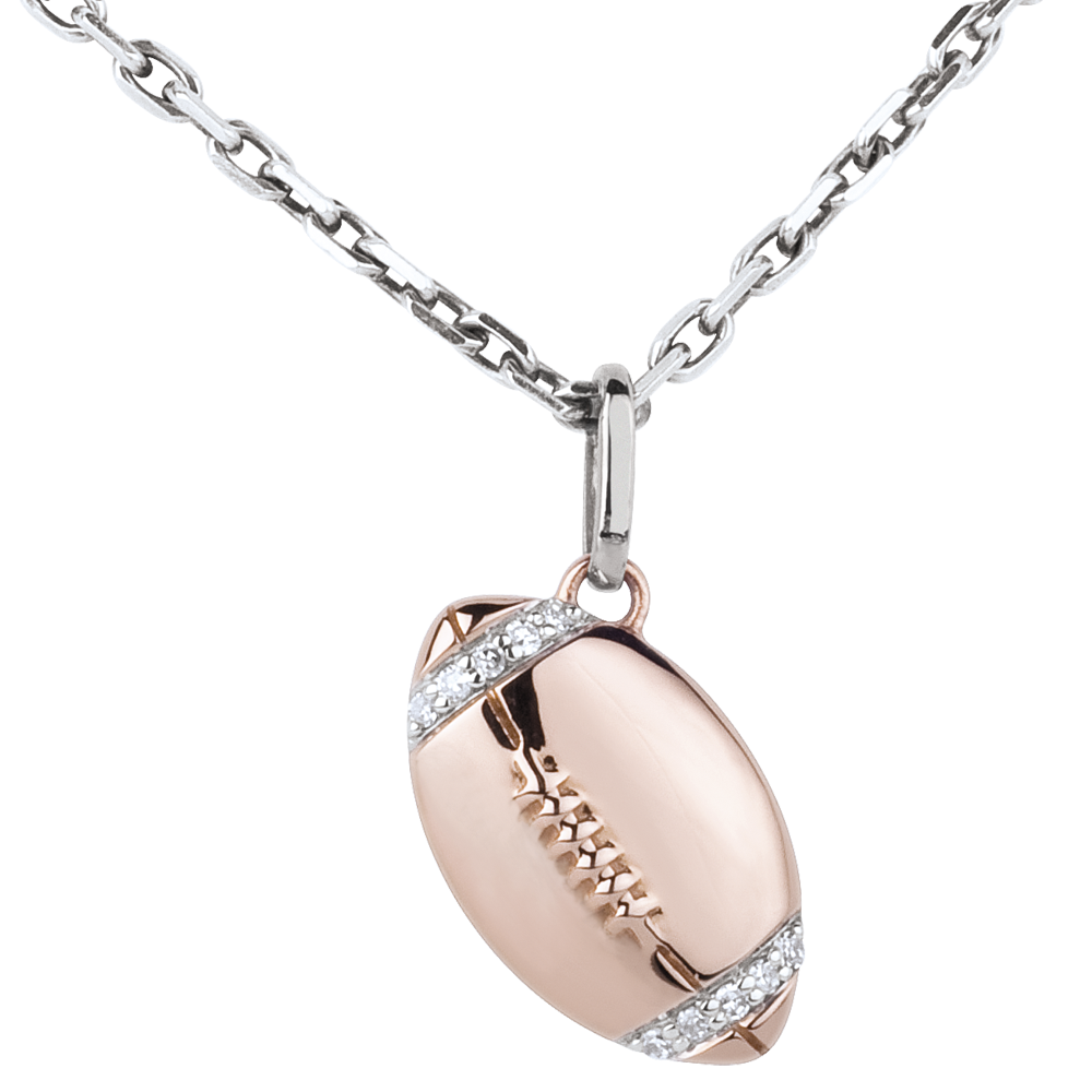 Wypukła zawieszka w kształcie piłki do rugby z różowego złota i białych diamentów.