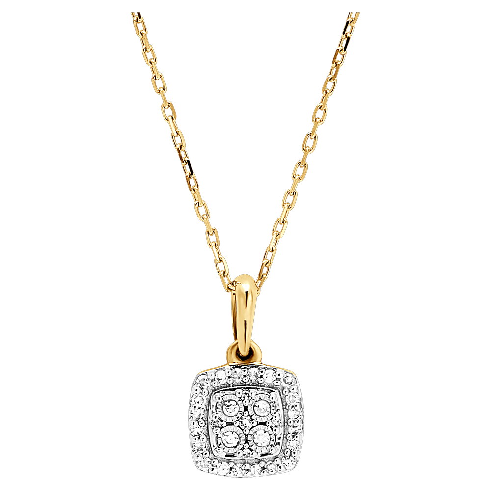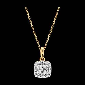 Blask zawieszki z kwadratowym diamentem otoczonym diamentową aureolą. Szlachetna i subtelna zawieszka z białego i żółtego złota emanująca ponadczasową elegancją.