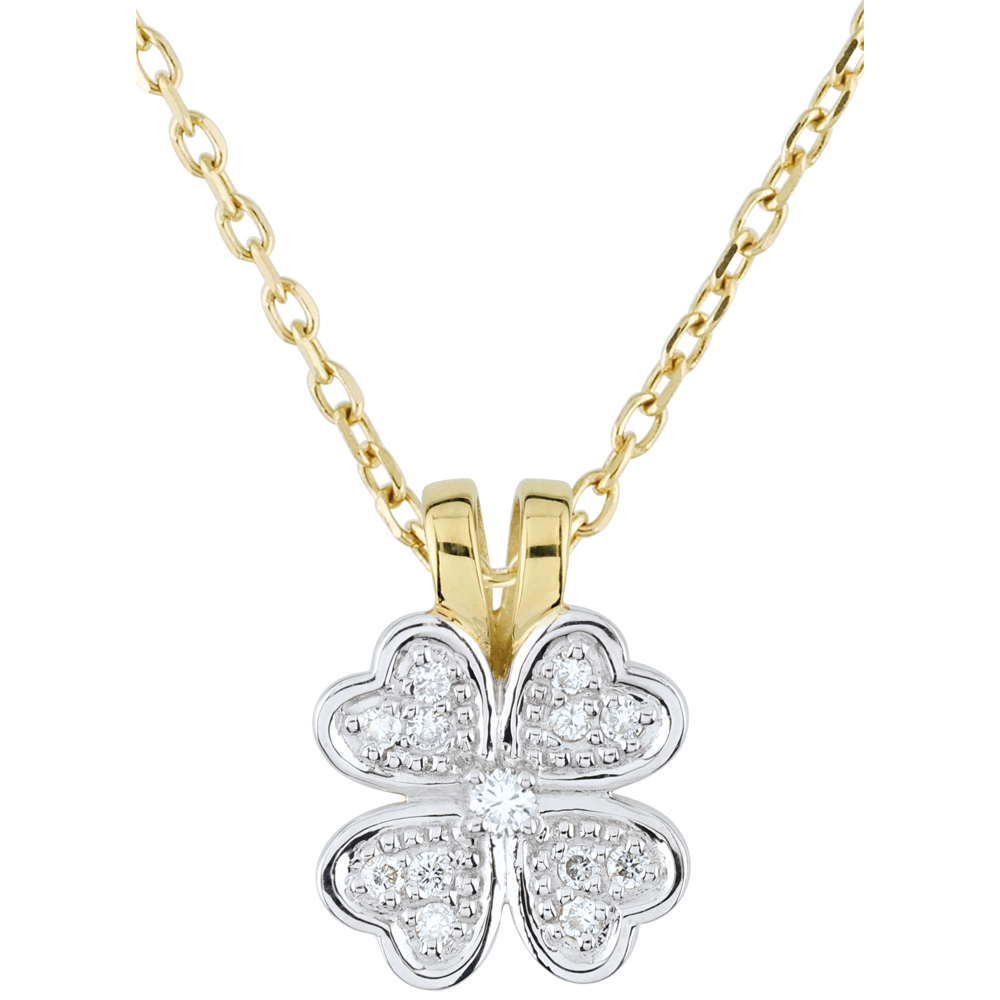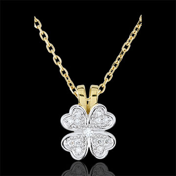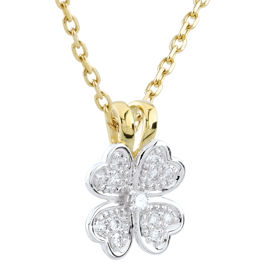 Koniczyna z białego złota wysadzana diamentami z kółkiem z żółtego złota. Klasyczna zawieszka do noszenia na łańcuszku z żółtego złota lub, w nowoczesnym wydaniu, na łańcuszku z białego złota.