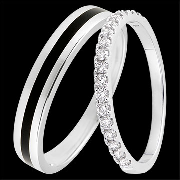 Elegancka para obrączek dla niej & dla niego. Dla niej: obrączka częściowo wysadzana 18 diamentami (0,26 ct). Dla niego: wypukła obrączka z białego złota przecięta pasmem czarnego lakieru.