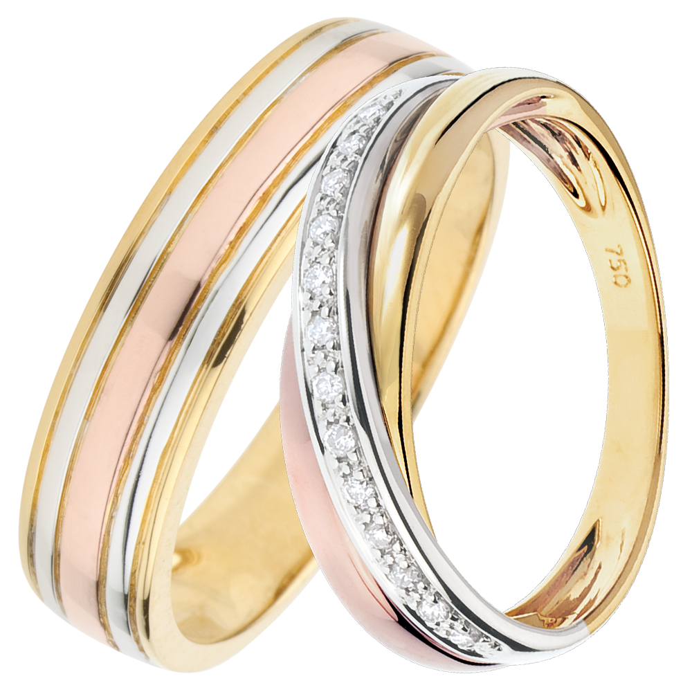 Wyważona obrączka z trzech rodzajów złota, podkreślona diamentami osadzonymi w białym złocie. Pierścionek z trzech rodzajów złota to wyrób, który może być obrączką ślubną lub wyjątkowym prezentem.